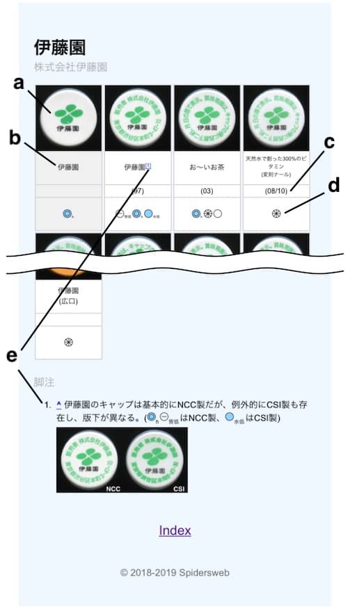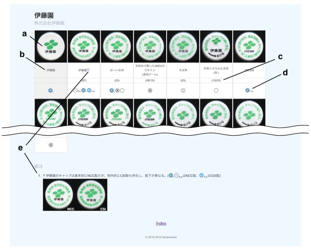 - キャップは基本的に販売者(以下メーカー)別に分類する。ただしキャップの種類が少ないメーカーに関してはその商品の種別で「その他」「お茶」「水」に分類する。
